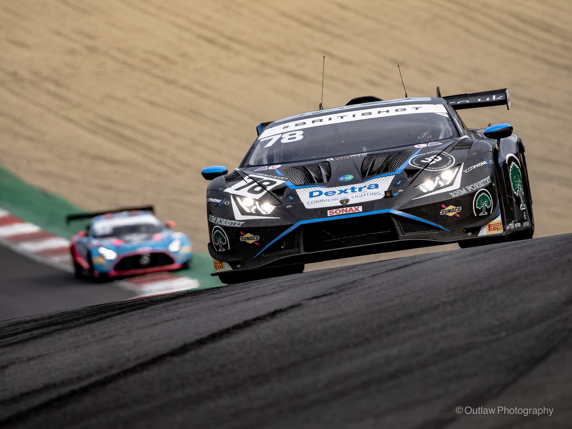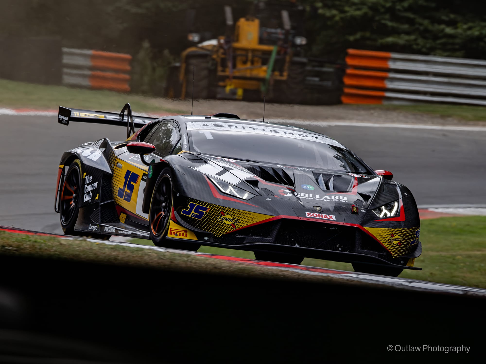 Plowman eventually recovered his McLaren under the yellow flag back to the pits for fresh tyres, while Barwell’s Lamborghini, car 78 had sustained some damage from the same incident, with smoke trailing from its front left tyre, you could see that it had driven over a large piece of carbon fibre, forcing the car in to the gravel at the next turn. Fortunately, the car was able to limp back to the pits.