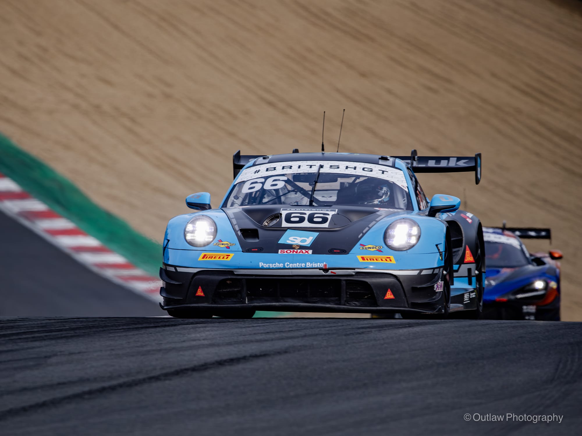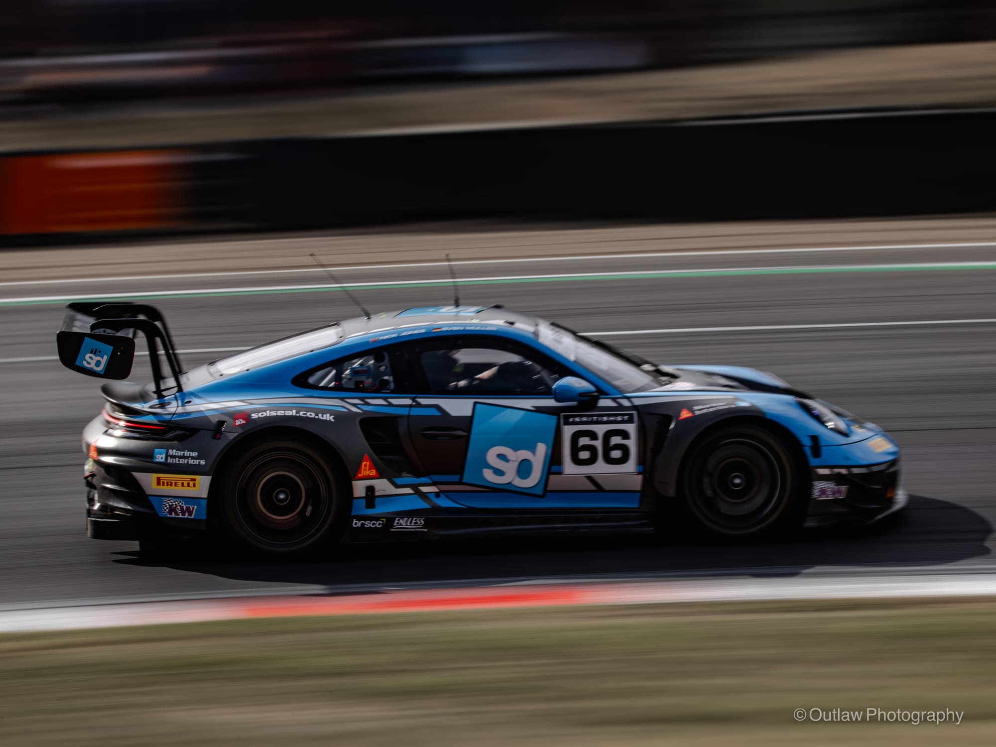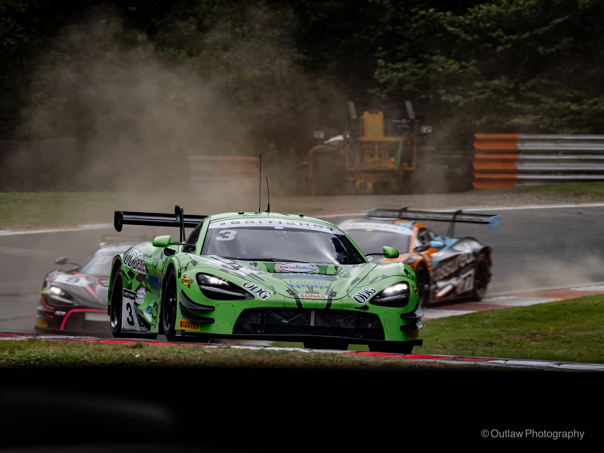 The battles in GT3 were just as brutal. Team Parker’s Porsche, car 66, aggressively driven by Sebastien Müller, lunged down the inside of Martin Plowman’s Paddock Motorsport McLaren in the fight for fifth. Contact sent Plowman spinning and left some large debris and carbon fibre shards scattered across the circuit. Müller’s Porsche roared past but sustained a suspected broken wheel and careered into the Hawthorns gravel, ending its race. A full course yellow was signalled so the Porsche could be rescued.