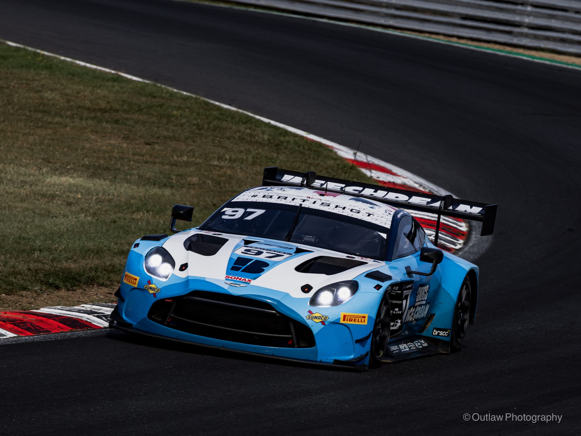 Q2 saw drivers switch over as the grid was set by combined times. Car 42, 2 Seas Motorsport’s Mercedes AMG GT3 slid heavily into the gravel, highlighting just how easy it was to overstep the limit. Once again, car 18 set the pace for 2 Seas Motorsport, while Beechdean’s Aston Martin, car 97, topped the Silver-Am runners. When the times were tallied, 2 Seas Motorsport secured pole position with car 18, followed by Blackthorn’s Aston Martin, car 7, and Barwell Motorsport’s Lamborghini, car 78.