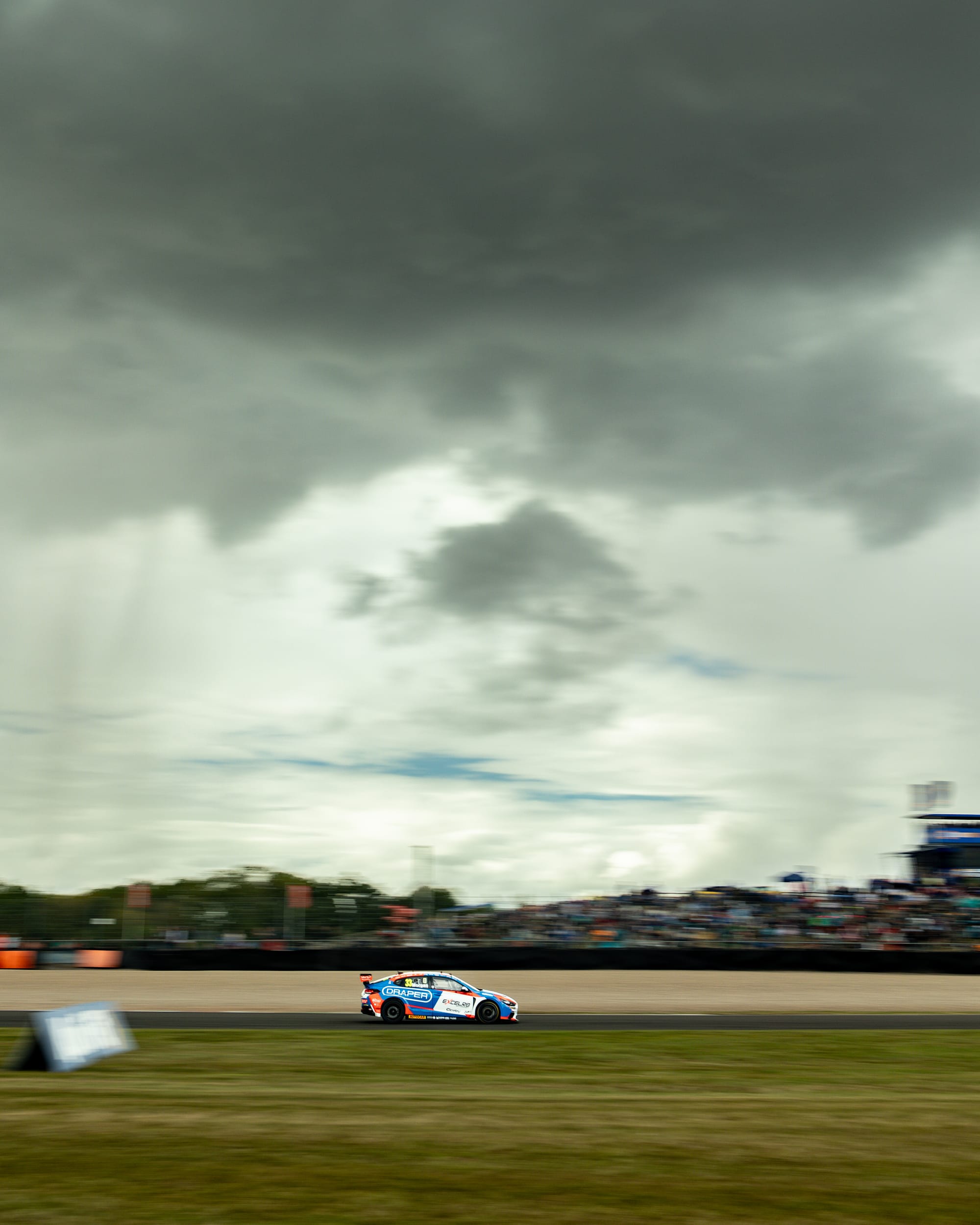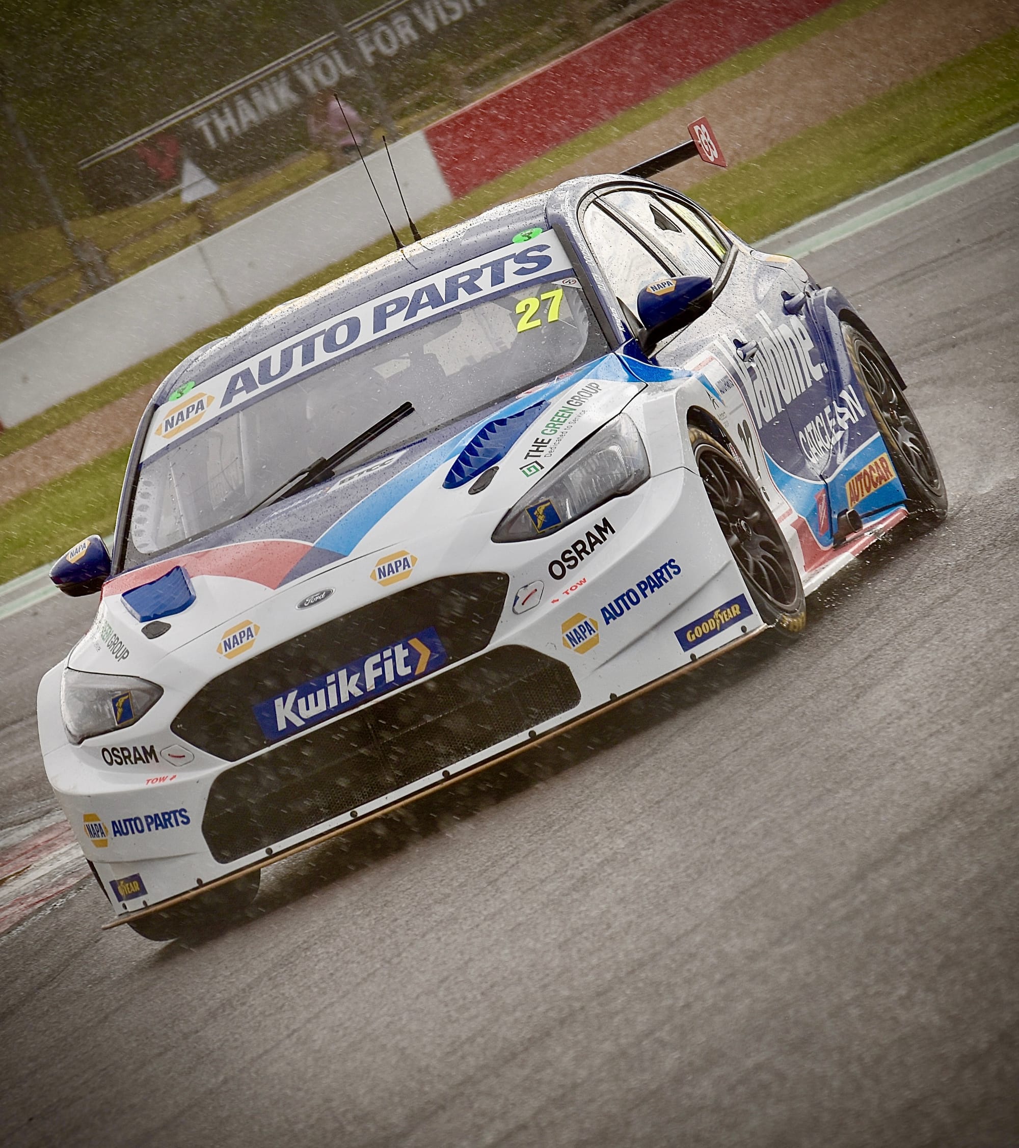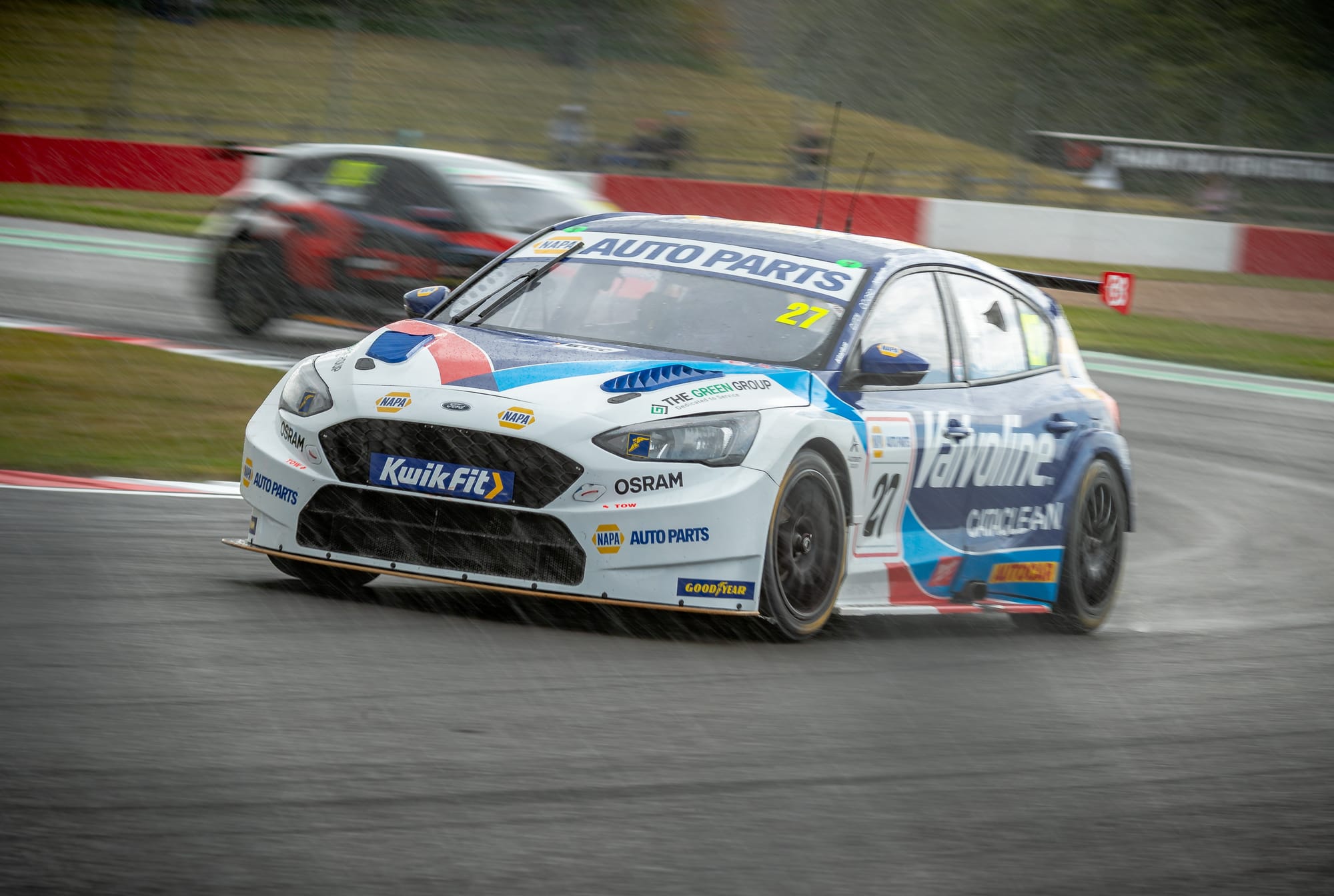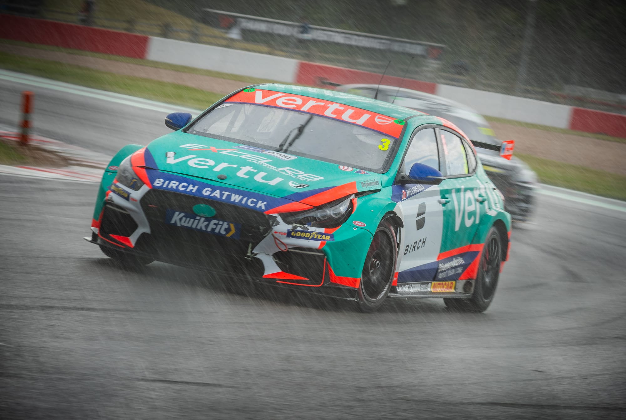 The NAPA Racing UK driver had already moved into the lead after muscling past Team VERTU’s Tom Ingram in the opening stages, but the race was turned on its head when the skies suddenly opened. A torrential downpour caught much of the field out, with Cammish himself skating across the sodden tarmac and into the gravel. He wasn’t alone — half a dozen cars followed in quick succession, leaving plumes of spray and chaos at almost every corner.
