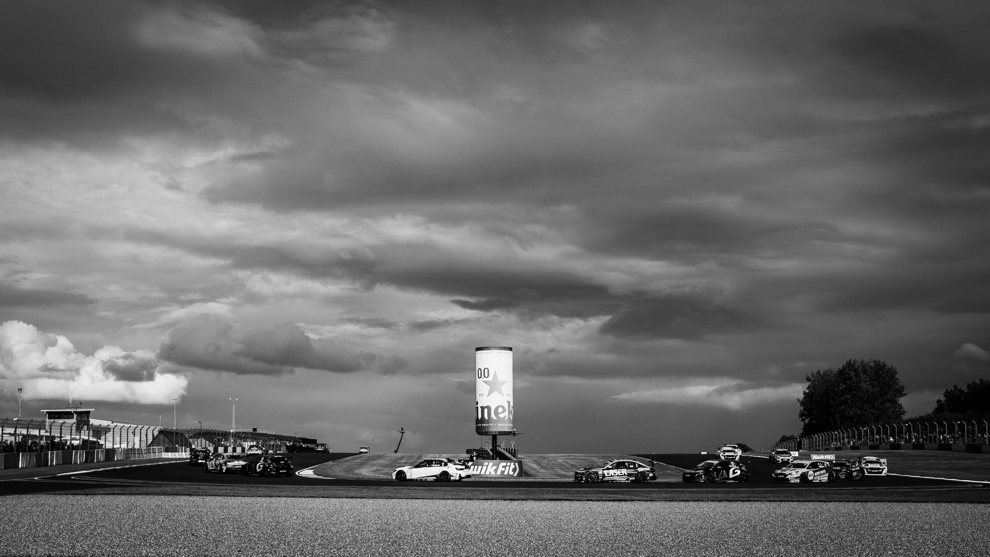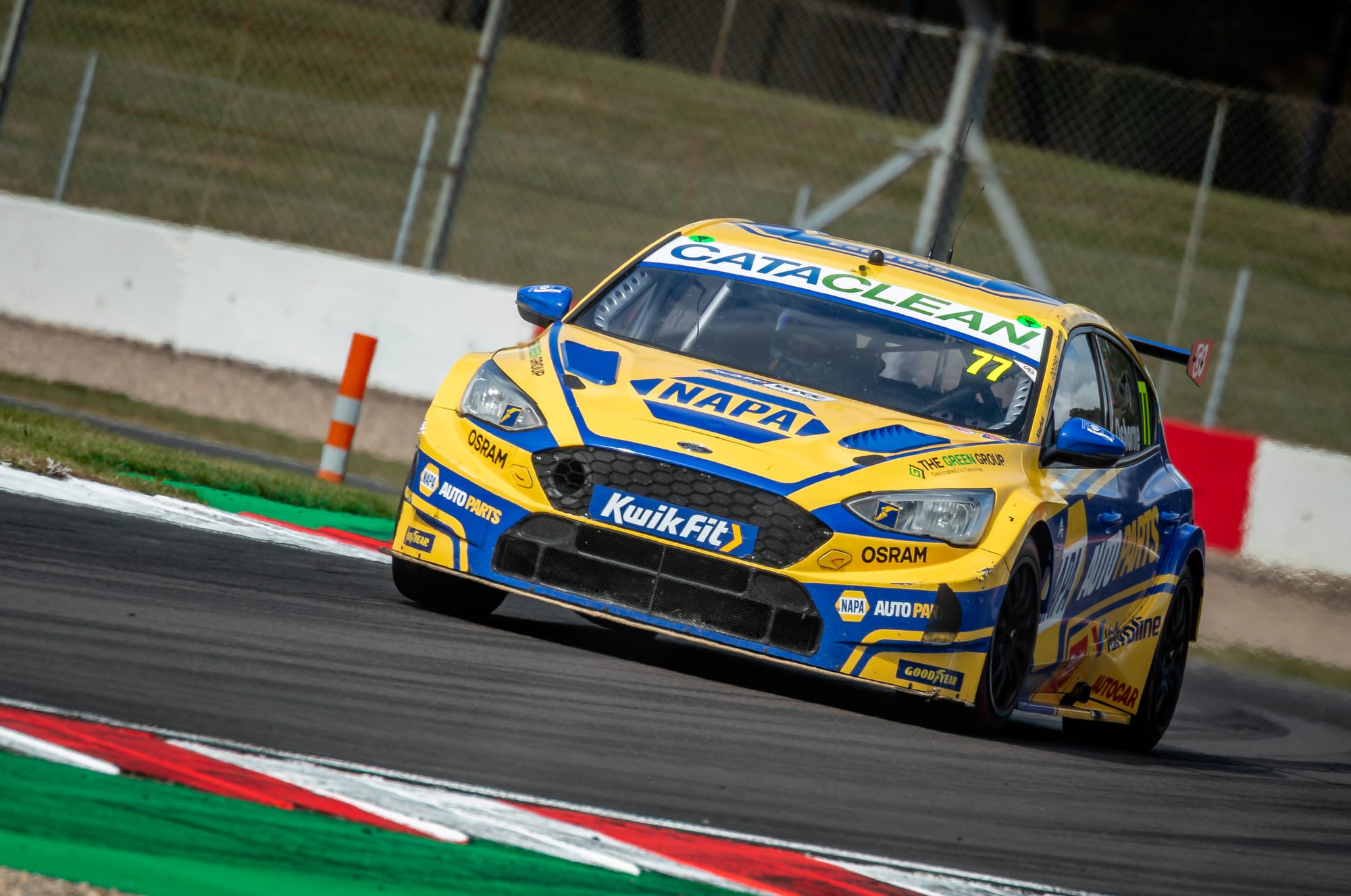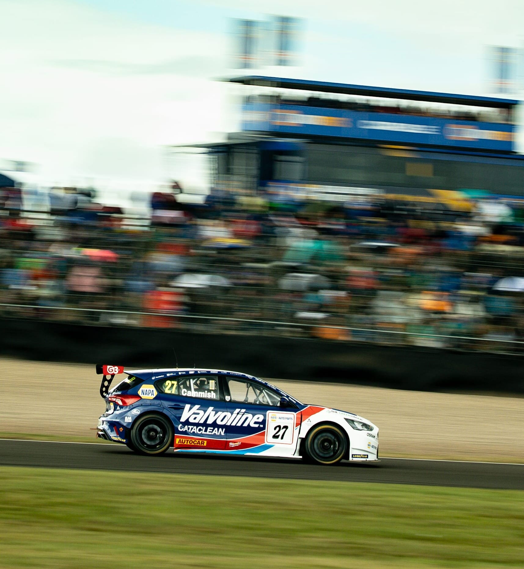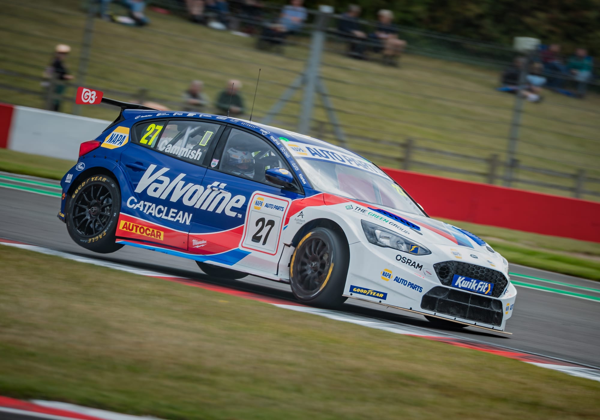 The NAPA Racing UK driver had already moved into the lead after muscling past Team VERTU’s Tom Ingram in the opening stages, but the race was turned on its head when the skies suddenly opened. A torrential downpour caught much of the field out, with Cammish himself skating across the sodden tarmac and into the gravel. He wasn’t alone — half a dozen cars followed in quick succession, leaving plumes of spray and chaos at almost every corner.