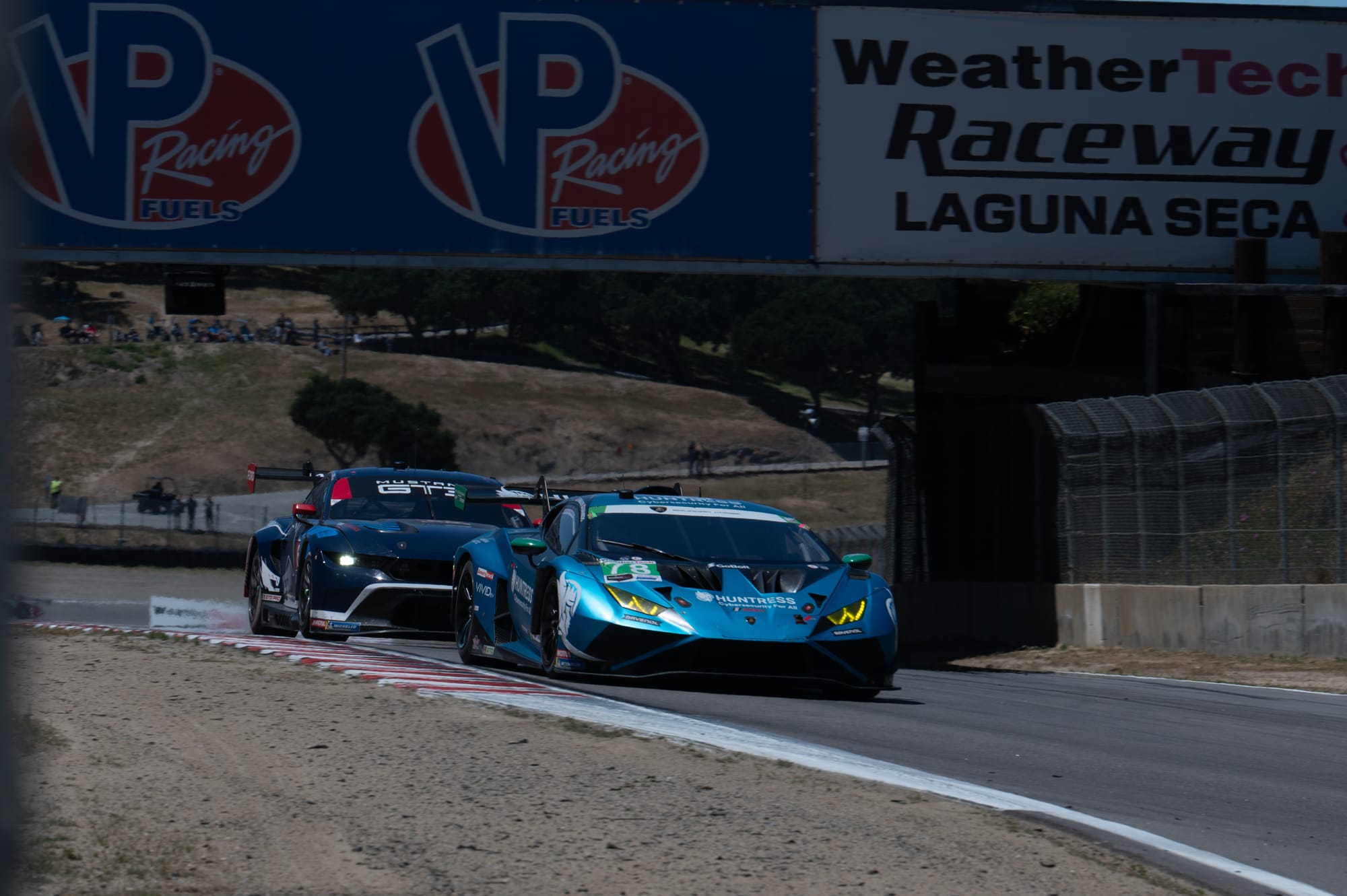 With just six minutes to go, a nail-biting trio emerged: Jaminet leading, followed by Tandy and Vanthoor โ all within a mere 1.283 seconds. On the final lap, it all came to a head. Vanthoor got a slingshot exit out of Turn 10, catching Tandy defending as the No. 7 Porsche got momentarily slowed behind a GTD-Pro backmarker the no.9 Pfaff Motorsports Lamborghini Huracan GT3 EVO2. The result? A wild three-wide charge into the final corner.